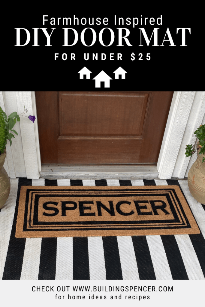 When I got home, I put my Silhouette to work. I found a font that was classic and block style. I cut out a stencil using the vinyl. After placing the stencil on the mat, I used my hair dryer to help seal the vinyl to the mat. I then took some acrylic paint and sponged the paint on. I let the first coat dry and I lightly sprayed it with outdoor paint. After the paint dried I removed the vinyl stencil. Viola!